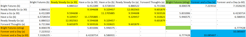 To work with this small example we will assume that only 3 tracks can be displayed, since the number of potential tracks (small in this example for clarity) is usually much greater than the number shown. Using a conventional MLT approach, the returned tracks for Bright Futures (b) would be: Bright Futures (sting), Forever and a Day (a 60), and Forever and a Day (a). Clustering gives results: Bright Futures (sting), Forever and a Day (a), Ready Steady Go (a 30).